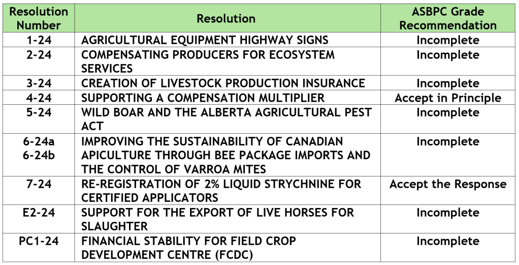 Letters were resent to Alberta Agriculture and Irrigation, Alberta Transportation and Economic Corridors, PMRA, CFIA, and AAFC asking them to please respond by May 15, 2024. The next ASBPC Resolution Review meeting is scheduled for May 24, 2024.